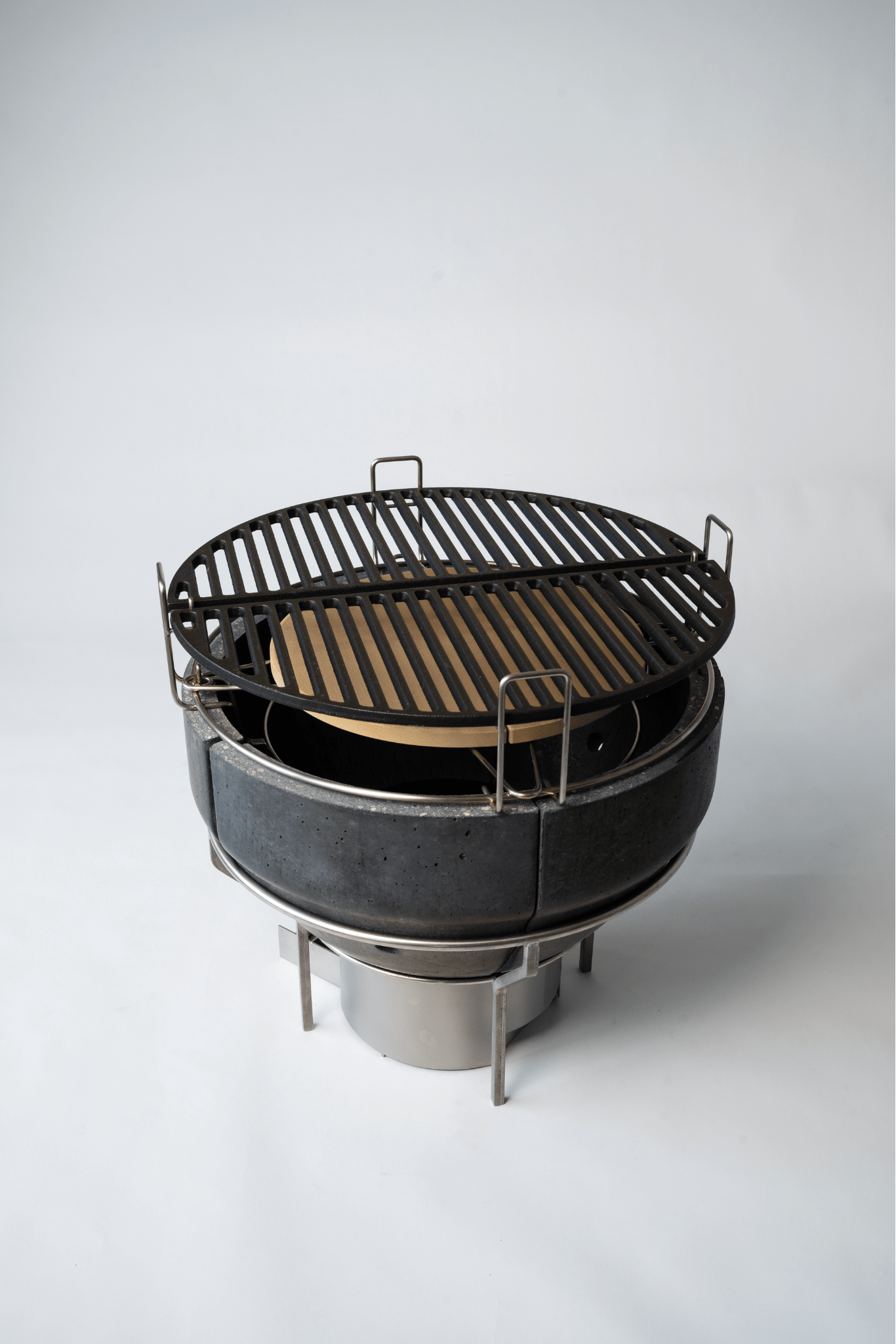 Kulinarisches Interface: Ø 47 cm modulares System. Ein Hybrid aus eingebranntem Gusseisen und Edelstahl in Profiqualität, entwickelt für das gesamte Spektrum vom scharfen Anbraten über indirektes Low & Slow Grillen, bis hin zum Backen von Pizza